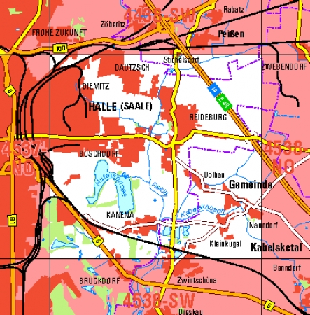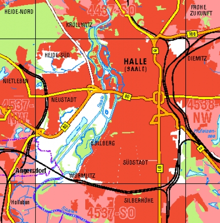Maßstab 1:10 000, Nomenklatur: 4537-NO, Name des Kartenblatts: Halle (Saale), Auflagejahr: 2022, Blattschnitt: Normalblattschnitt (Preußische Landesaufnahme), Gradabteilungskarte mit 5 min geographischer Länge und 3 min geographischer Breite, Geodätischer Raumbezug: GRS80-Ellipsoid, ...