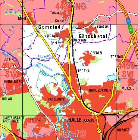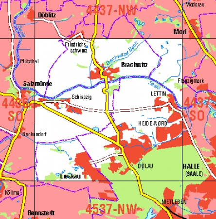 Maßstab 1:10 000, Nomenklatur: 4437-SO, Name des Kartenblatts: Halle (Saale) N, Auflagejahr: 2020, Blattschnitt: Normalblattschnitt (Preußische Landesaufnahme), Gradabteilungskarte mit 5 min geographischer Länge und 3 min geographischer Breite, Geodätischer Raumbezug: GRS80-Ellipsoid, ...