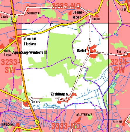Maßstab 1:10 000, Nomenklatur: 3233-SO, Name des Kartenblatts: Badel, Auflagejahr: 2021, Blattschnitt: Normalblattschnitt (Preußische Landesaufnahme), Gradabteilungskarte mit 5 min geographischer Länge und 3 min geographischer Breite, Geodätischer Raumbezug: GRS80-Ellipsoid, ...