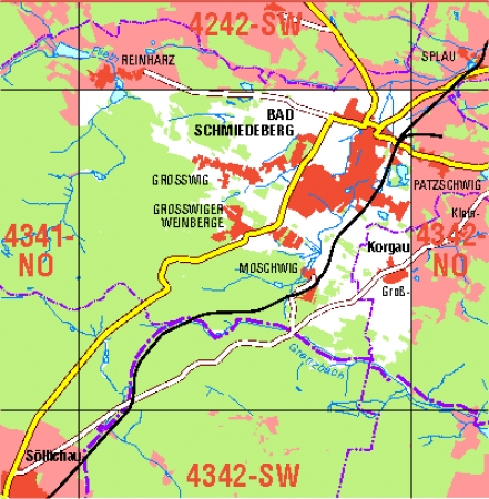 Maßstab 1:10 000, Nomenklatur: 4342-NO, Name des Kartenblatts: Bad Schmiedeberg-Patzschwig, Auflagejahr: 2022, Blattschnitt: Normalblattschnitt (Preußische Landesaufnahme), Gradabteilungskarte mit 5 min geographischer Länge und 3 min geographischer Breite, Geodätischer Raumbezug: ...