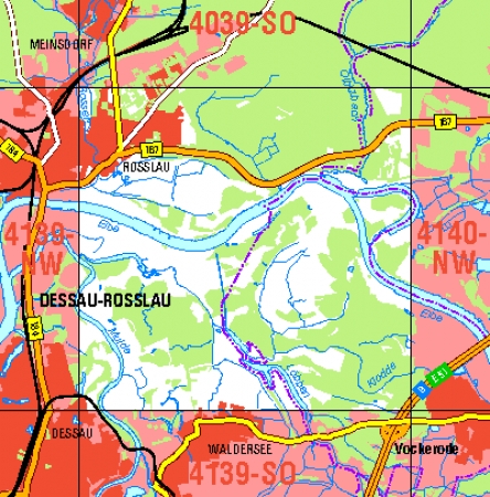 Maßstab 1:10 000, Nomenklatur: 4139-NW, Name des Kartenblatts: Roßlau, Auflagejahr: 2024, Blattschnitt: Normalblattschnitt (Preußische Landesaufnahme), Gradabteilungskarte mit 5 min geographischer Länge und 3 min geographischer Breite, Geodätischer Raumbezug: GRS80-Ellipsoid, ...