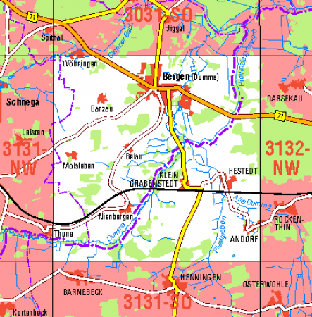 Maßstab 1:10 000, Nomenklatur: 3131-NO, Name des Kartenblatts: Bergen (Dumme), Auflagejahr: 2022, Der Anteil Sachsen-Anhalt (ST) kann bis zur Landesgrenze Niedersachsen (NI) bereitgestellt werden. Das Gebiet zu NI wird als weiße Fläche dargestellt. Blattschnitt: Normalblattschnitt ...