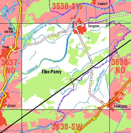 Maßstab 1:10 000, Nomenklatur: 3638-NW, Name des Kartenblatts: Bergzow, Auflagejahr: 2021, Blattschnitt: Normalblattschnitt (Preußische Landesaufnahme), Gradabteilungskarte mit 5 min geographischer Länge und 3 min geographischer Breite, Geodätischer Raumbezug: GRS80-Ellipsoid, ...