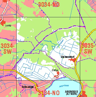 Maßstab 1:10 000, Nomenklatur: 3034-SO, Name des Kartenblatts: Ziemendorf, Auflagejahr: 2021, Der Anteil Sachsen-Anhalt (ST) kann bis zur Landesgrenze Niedersachsen (NI) bereitgestellt werden. Das Gebiet zu NI wird als weiße Fläche dargestellt. Blattschnitt: Normalblattschnitt ...