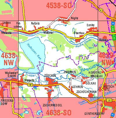 Maßstab 1:10 000, Nomenklatur: 4638-NO, Name des Kartenblatts: Zöschen, Auflagejahr: 2021, Blattschnitt: Normalblattschnitt (Preußische Landesaufnahme), Gradabteilungskarte mit 5 min geographischer Länge und 3 min geographischer Breite, Geodätischer Raumbezug: GRS80-Ellipsoid, ...