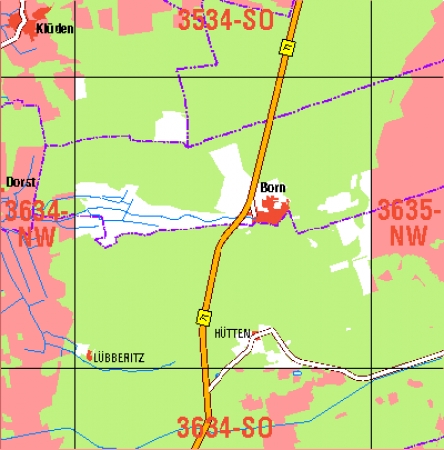 Maßstab 1:10 000, Nomenklatur: 3634-NO, Name des Kartenblatts: Born, Auflagejahr: 2024, Blattschnitt: Normalblattschnitt (Preußische Landesaufnahme), Gradabteilungskarte mit 5 min geographischer Länge und 3 min geographischer Breite, Geodätischer Raumbezug: GRS80-Ellipsoid, ...