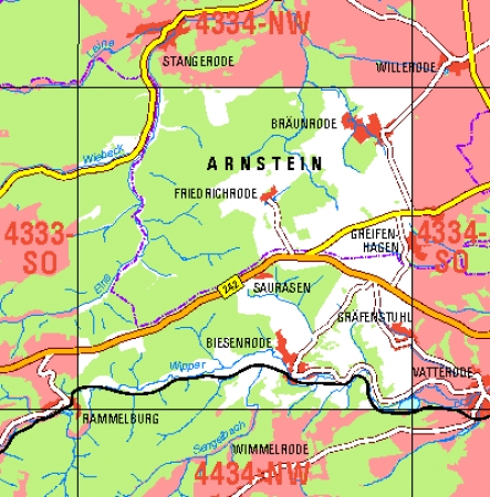 Maßstab 1:10 000, Nomenklatur: 4334-SW, Name des Kartenblatts: Bräunrode, Auflagejahr: 2025, Blattschnitt: Normalblattschnitt (Preußische Landesaufnahme), Gradabteilungskarte mit 5 min geographischer Länge und 3 min geographischer Breite, Geodätischer Raumbezug: GRS80-Ellipsoid, ...