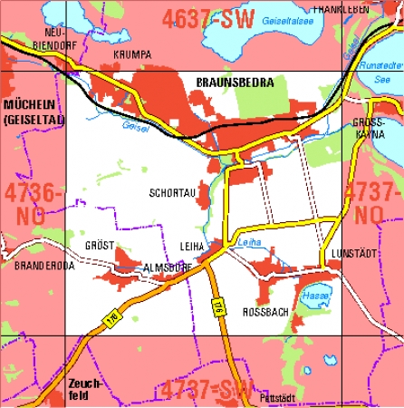 Maßstab 1:10 000, Nomenklatur: 4737-NW, Name des Kartenblatts: Braunsbedra, Auflagejahr: 2025, Blattschnitt: Normalblattschnitt (Preußische Landesaufnahme), Gradabteilungskarte mit 5 min geographischer Länge und 3 min geographischer Breite, Geodätischer Raumbezug: GRS80-Ellipsoid, ...
