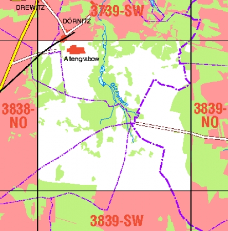 Maßstab 1:10 000, Nomenklatur: 3839-NW, Name des Kartenblatts: Altengrabow, Auflagejahr: 2021, Blattschnitt: Normalblattschnitt (Preußische Landesaufnahme), Gradabteilungskarte mit 5 min geographischer Länge und 3 min geographischer Breite, Geodätischer Raumbezug: GRS80-Ellipsoid, ...