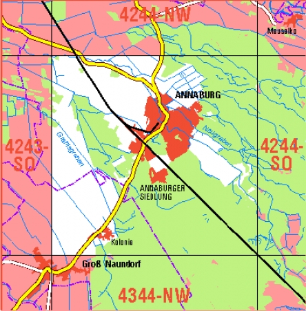 Maßstab 1:10 000, Nomenklatur: 4244-NW, Name des Kartenblatts: Annaburg-Purzien, Auflagejahr: 2023, Blattschnitt: Normalblattschnitt (Preußische Landesaufnahme), Gradabteilungskarte mit 5 min geographischer Länge und 3 min geographischer Breite, Geodätischer Raumbezug: GRS80-Ellipsoid, ...