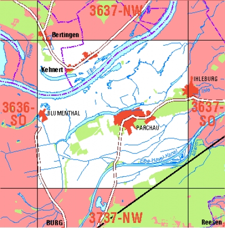 Maßstab 1:10 000, Nomenklatur: 3637-SW, Name des Kartenblatts: Burg-Parchau, Auflagejahr: 2025, Blattschnitt: Normalblattschnitt (Preußische Landesaufnahme), Gradabteilungskarte mit 5 min geographischer Länge und 3 min geographischer Breite, Geodätischer Raumbezug: GRS80-Ellipsoid, ...