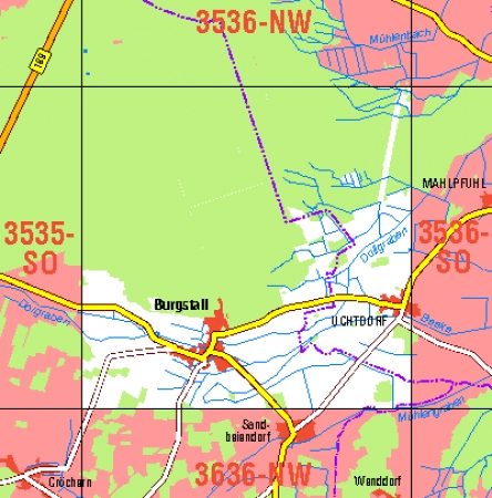 Maßstab 1:10 000, Nomenklatur: 3536-SW, Name des Kartenblatts: Burgstall, Auflagejahr: 2024, Blattschnitt: Normalblattschnitt (Preußische Landesaufnahme), Gradabteilungskarte mit 5 min geographischer Länge und 3 min geographischer Breite, Geodätischer Raumbezug: GRS80-Ellipsoid, ...