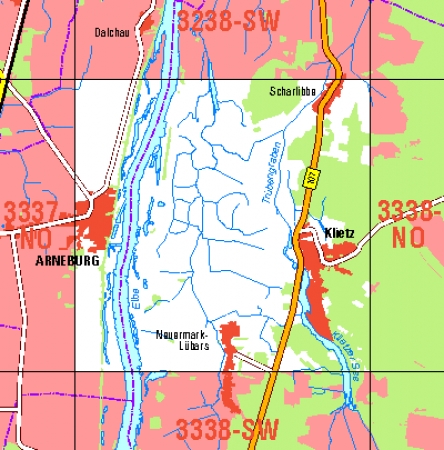 Maßstab 1:10 000, Nomenklatur: 3338-NW, Name des Kartenblatts: Arneburg, Auflagejahr: 2021, Blattschnitt: Normalblattschnitt (Preußische Landesaufnahme), Gradabteilungskarte mit 5 min geographischer Länge und 3 min geographischer Breite, Geodätischer Raumbezug: GRS80-Ellipsoid, ...