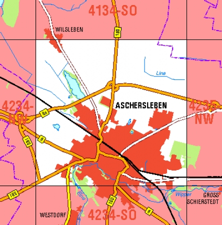 Maßstab 1:10 000, Nomenklatur: 4234-NO, Name des Kartenblatts: Aschersleben N, Auflagejahr: 2023, Blattschnitt: Normalblattschnitt (Preußische Landesaufnahme), Gradabteilungskarte mit 5 min geographischer Länge und 3 min geographischer Breite, Geodätischer Raumbezug: GRS80-Ellipsoid, ...