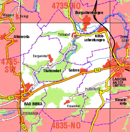 Maßstab 1:10 000, Nomenklatur: 4735-SO, Name des Kartenblatts: Bad Bibra, Auflagejahr: 2025, Blattschnitt: Normalblattschnitt (Preußische Landesaufnahme), Gradabteilungskarte mit 5 min geographischer Länge und 3 min geographischer Breite, Geodätischer Raumbezug: GRS80-Ellipsoid, ...