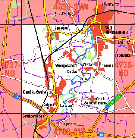 Maßstab 1:10 000, Nomenklatur: 4738-NW, Name des Kartenblatts: Bad Dürrenberg, Auflagejahr: 2022, Blattschnitt: Normalblattschnitt (Preußische Landesaufnahme), Gradabteilungskarte mit 5 min geographischer Länge und 3 min geographischer Breite, Geodätischer Raumbezug: ...
