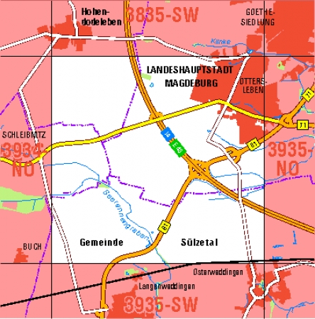 Maßstab 1:10 000, Nomenklatur: 3935-NW, Name des Kartenblatts: Magdeburg-Ottersleben, Auflagejahr: 2023, Blattschnitt: Normalblattschnitt (Preußische Landesaufnahme), Gradabteilungskarte mit 5 min geographischer Länge und 3 min geographischer Breite, Geodätischer Raumbezug: ...