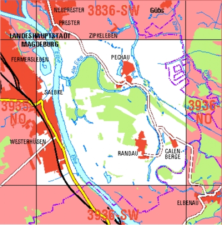 Maßstab 1:10 000, Nomenklatur: 3936-NW, Name des Kartenblatts: Magdeburg-Pechau, Auflagejahr: 2024, Blattschnitt: Normalblattschnitt (Preußische Landesaufnahme), Gradabteilungskarte mit 5 min geographischer Länge und 3 min geographischer Breite, Geodätischer Raumbezug: GRS80-Ellipsoid, ...