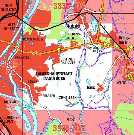Maßstab 1:10 000, Nomenklatur: 3835-SW, Name des Kartenblatts: Magdeburg-Diesdorf, Auflagejahr: 2024, Blattschnitt: Normalblattschnitt (Preußische Landesaufnahme), Gradabteilungskarte mit 5 min geographischer Länge und 3 min geographischer Breite, Geodätischer Raumbezug: ...