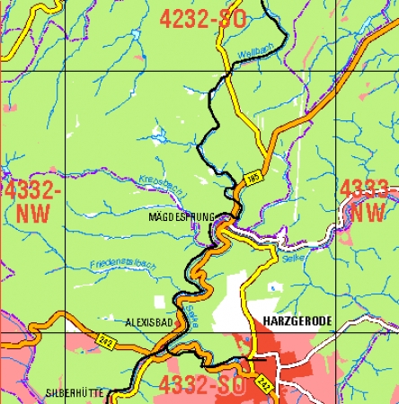 Maßstab 1:10 000, Nomenklatur: 4332-NO, Name des Kartenblatts: Mägdesprung, Auflagejahr: 2025, Blattschnitt: Normalblattschnitt (Preußische Landesaufnahme), Gradabteilungskarte mit 5 min geographischer Länge und 3 min geographischer Breite, Geodätischer Raumbezug: GRS80-Ellipsoid, ...