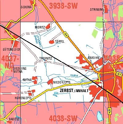 Maßstab 1:10 000, Nomenklatur: 4038-NW, Name des Kartenblatts: Zerbst/Anhalt W, Auflagejahr: 2022, Blattschnitt: Normalblattschnitt (Preußische Landesaufnahme), Gradabteilungskarte mit 5 min geographischer Länge und 3 min geographischer Breite, Geodätischer Raumbezug: GRS80-Ellipsoid, ...