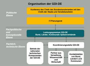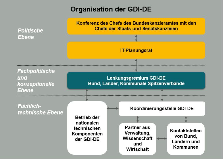 - Das Lenkungsgremium der GDI-DE setzt sich aus Vertretern des Bundes, der 16 Bundesländer und der drei kommunalen Spitzenverbände zusammen. Vertreter aus Wirtschaft und Wissenschaft wirken beratend mit. Es steuert und koordiniert den Aufbau und die Entwicklung der GDI-DE und nimmt die Funktion als nationale Anlaufstelle zur Umsetzung der INSPIRE-Richtlinie wahr.