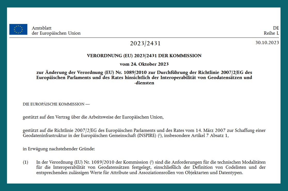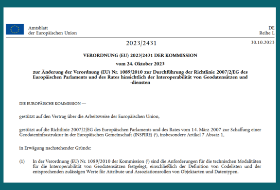 Am 30. Oktober 2023 ist die Verordnung (EU) 2023/2431 zur Änderung der Verordnung (EU) Nr. 1089/2010 zur Durchführung der INSPIRE-Richtlinie hinsichtlich der Interoperabilität von Geodatensätzen und -diensten veröffentlicht worden. Diese trat am 19. November 2023 in Kraft.