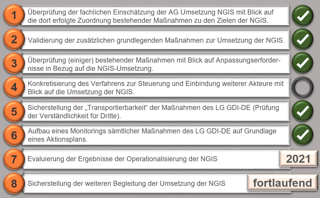 Passend dazu konnte das allumfassende Monitoring aller Maßnahmen der GDI-DE im letzten Jahr abschließend aufgebaut und in Betrieb genommen werden. Damit sind nun fast alle fixen Maßnahmen im Umsetzungsplan der NGIS realisiert worden (Abb.). Das GDI-DE-Monitoring soll analog zum INSPIRE-Monitoring die Qualität der Umsetzung der GDI-DE transparent darstellen. Über eine GDI-DE-weite Priorisierung der einzelnen Umsetzungen und Ableitung von Kennzahlen wird das Ziel der dauerhaften Qualitätssicherung durch die Akteure innerhalb der GDI-DE verfolgt.
