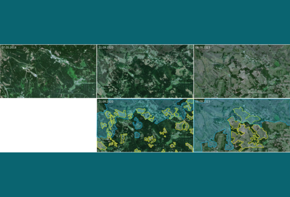 Im folgenden Beispiel (Abb. 1) wird die starke Veränderung der Waldflächen bei Schierke (Harz) in den vergangenen fünf Jahren veranschaulicht. Die markierten Flächen dieser Zeitreihe heben die markantesten Veränderungen bezüglich gerodeten (gelb) und abgestorbenen Waldgebieten (blau) vor. Anhand dieses Beispiels soll die Nutzungsmöglichkeit von Satellitendaten bei der Landüberwachung in der Forstwirtschaft aufgezeigt werden. Erdbeobachtungsdaten liefern wichtiges Informationsmaterial für den Umweltschutz, zur Klimaüberwachung und zur Einschätzung von Naturkatastrophen.