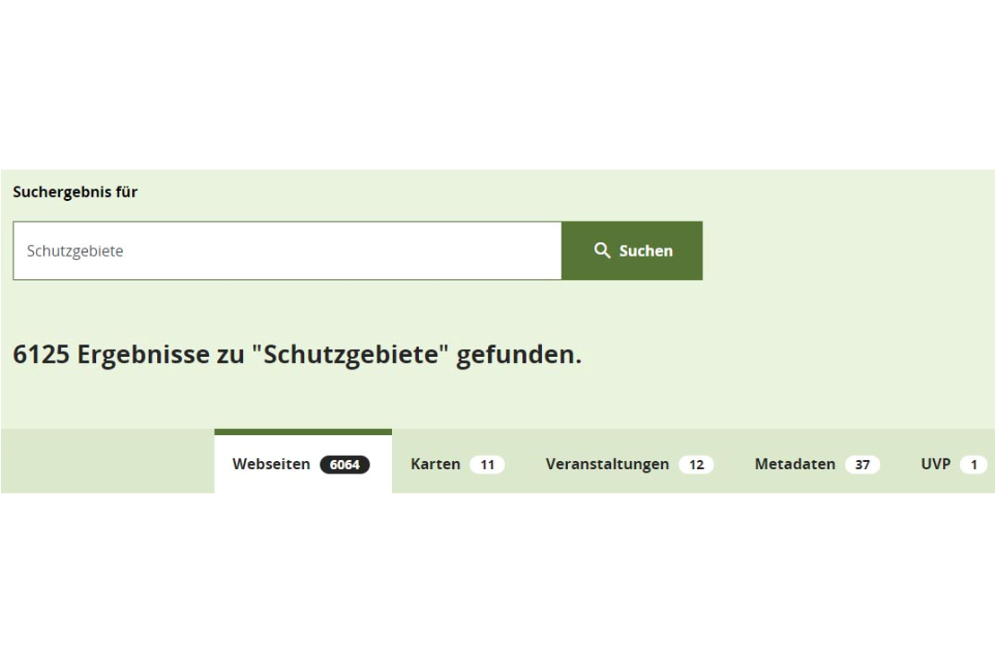 Weiterhin greift die Suchfunktion auf spezielle Informationsdienste zu. So können Umwelt- und Fachobjekte wie Schutzgebiete, Biotope und Forstreviere, aber auch Veranstaltungen, Erlebnisorte und Geotope direkt gefunden und auf einer Karte angezeigt werden (Abb. 2).