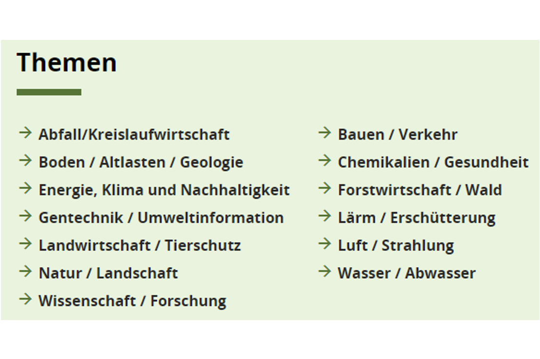 Schnelle Informationen in aktuellen Lagen und vertiefende Informationen zu einer Vielzahl von Umwelt-Themen werden , z. B. zu Fachportalen und Verlinkungen zu externen Angeboten ermöglicht (Abb. 3). Über die vielen Fachthemen können sich Bürgerinnen und Bürger nun direkt informieren.