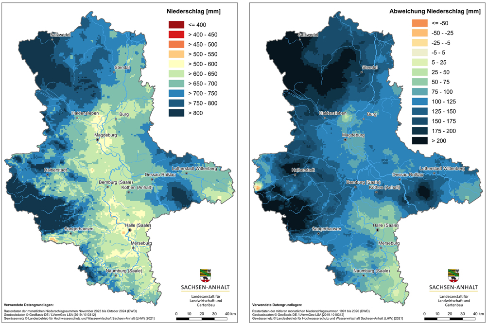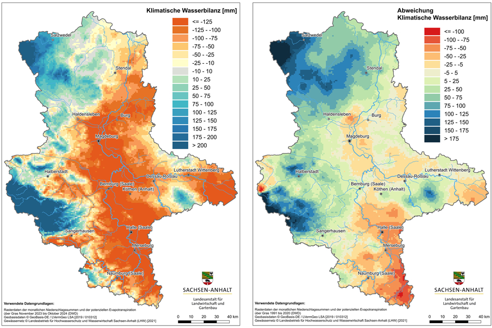 Die Landesanstalt für Landwirtschaft und Gartenbau des Landes Sachsen-Anhalt stellt Landwirtinnen und Landwirten sowie interessierten Nutzenden mit ihrem Service „Agrarmeteorologie“Informationen zur aktuellen Bodenfeuchte an Bodenwassermessplätzen sowie Darstellungen klimatologischer Parameter auf Basis von DWD-Stationsdaten zur Verfügung. Ergänzt werden die Auswertungen um Kartendarstellungen für den Niederschlag und die Klimatische Wasserbilanz für das Land Sachsen-Anhalt. Auf Grundlage von Rasterdatensätzen des Deutschen Wetterdienstes (DWD) mit einer räumlichen Auflösung von 1x1 km werden monatlich die Klimaparameter fortgeschrieben und dem langjährigen Mittel der Referenzperiode 1991 bis 2020 gegenübergestellt. Bezugszeitraum ist hierbei das hydrologische Jahr. Das hydrologische Jahr (auch als Abflussjahr bezeichnet) weicht vom Kalenderjahr ab. Es beginnt am 1. November und endet am 31. Oktober des Folgejahres. Mit Beginn des hydrologischen Jahres werden in der Regel die pflanzenverfügbaren Wasservorräte für die nachfolgende Vegetationsperiode aufgefüllt. Zudem werden auch die Niederschläge erfasst, die als Schnee gespeichert werden und erst im Frühjahr als Schmelzwasser abflusswirksam sind. Auf Grundlage der veröffentlichten Karten lassen sich Aussagen zur Verfügbarkeit (Defizite/ Überschüsse) pflanzenverfügbaren Wassers treffen und vor allem regional differenzieren.