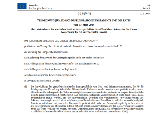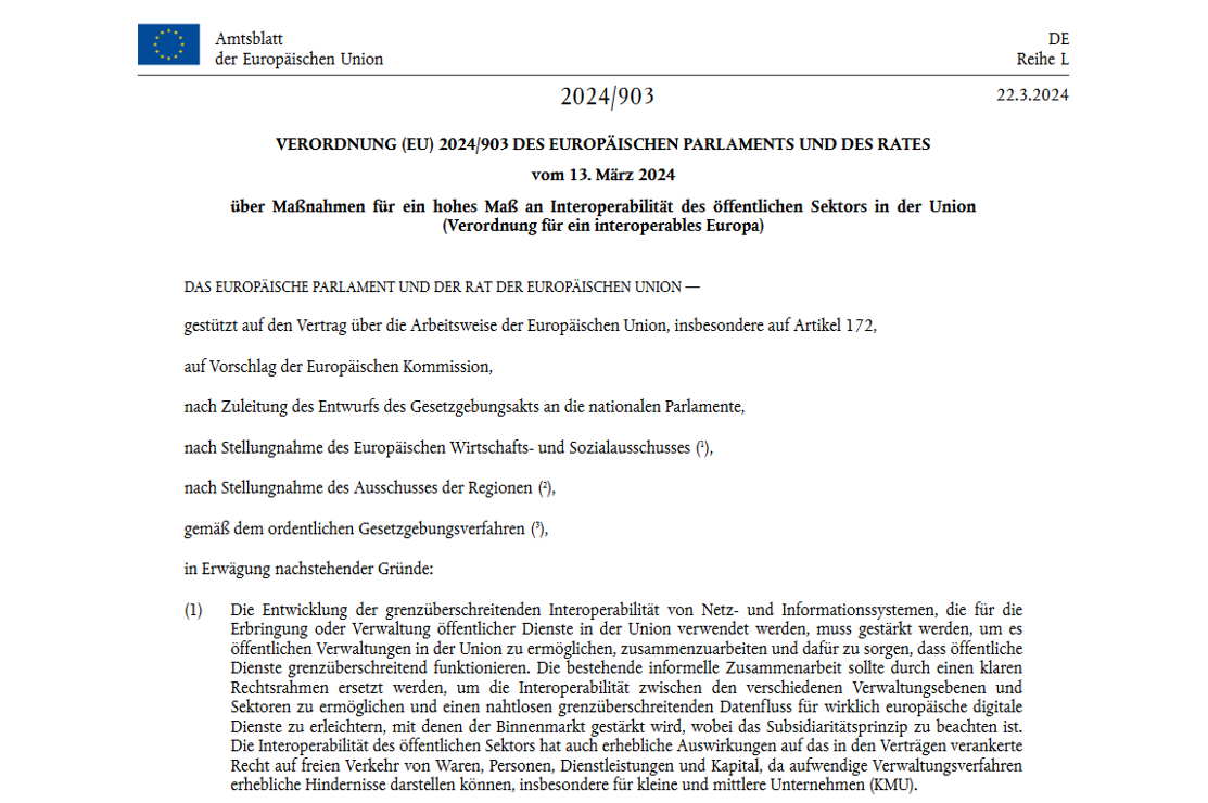 Im April 2024 ist die Verordnung (EU) 2024/903 vom 13. März 2024 für den digitalen Wandel der Europäischen Union in Kraft getreten. Dieser europäische Interoperabilitätsakt soll den grenzübergreifenden Datenaustausch erleichtern und schafft die Grundlage für eine beschleunigte Digitalisierung im öffentlichen Sektor.