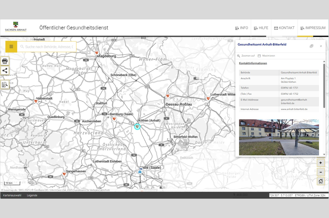 Für Sachsen-Anhalt ist ein digitaler Gesundheitsdienst geplant. Das zuständige Ministerium für Arbeit, Soziales, Gesundheit und Gleichstellung (MS) plant Standorte zum Öffentlichen Gesundheitsdienst (ÖGD), zum Beispiel zu Gesundheitsämtern, in einer Online-Anwendung bereitzustellen und für jedermann zugänglich zu machen. Ein erster Prototyp wird derzeit in Kooperation mit dem zentralen Geodatenmanager des Landes, dem Landesamt für Vermessung und Geoinformation (LVermGeo), vorbereitet. Es sind bereits Testdaten im Rahmen der Konzeption des Projektes in die künftige Webanwendung eingeflossen.
