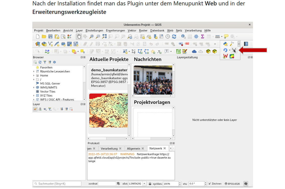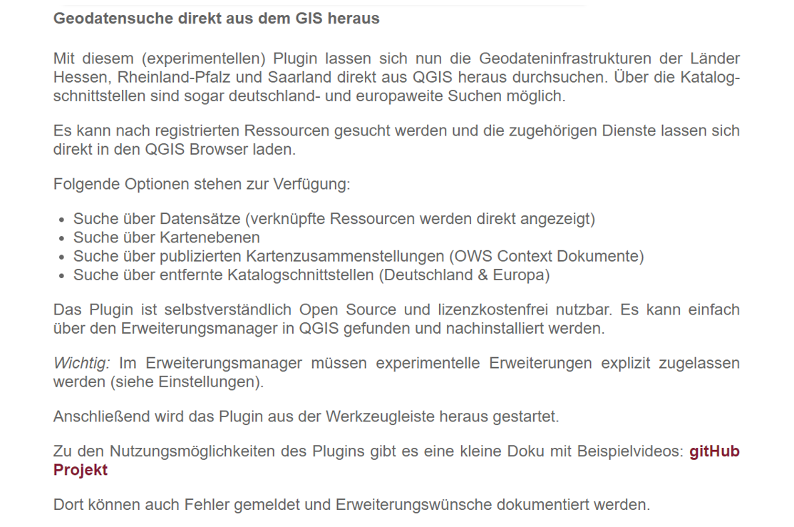 Auf dem Geoportal von Rheinland-Pfalz ist die Meldung zu einem Plugin für QGIS (Abb. 1), welches die Geodatensuche direkt aus dem GIS heraus ermöglicht, zu finden. Dies stellt einen interessanten Ansatz hinsichtlich der Nutzung der GDI-Komponenten, wie Metadaten und Diensten, in QGIS dar. Die Nutzungsmöglichkeiten des Plugins werden in einer Dokumentation mit Beispielvideos im gitHub Projekt beschrieben (Abb. 2).