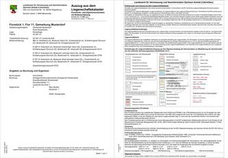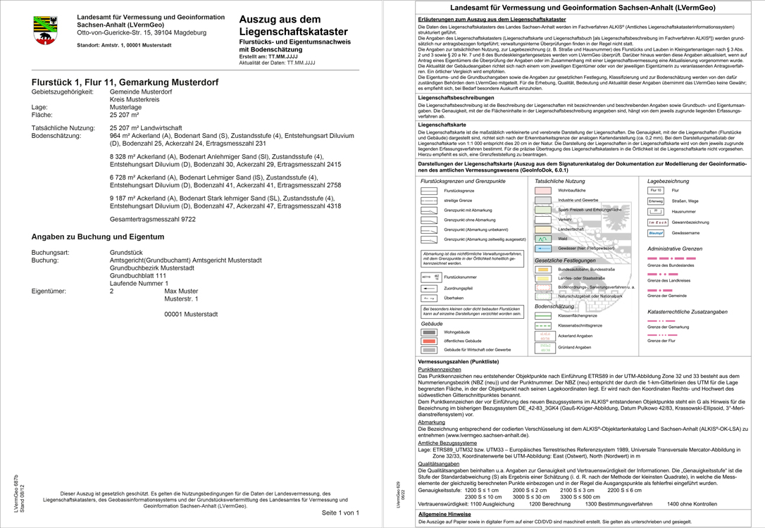 Auszüge aus dem Liegenschaftsbuch werden mit den bezeichnenden (z. B. Flurstücksnummer) und beschreibenden Daten (z. B. Flächeninhalt der Flurstücke) des Liegenschaftskatasters sowie die Grundbuch- und Eigentumsangaben.je nach gewählter Ausgabe abgegeben.