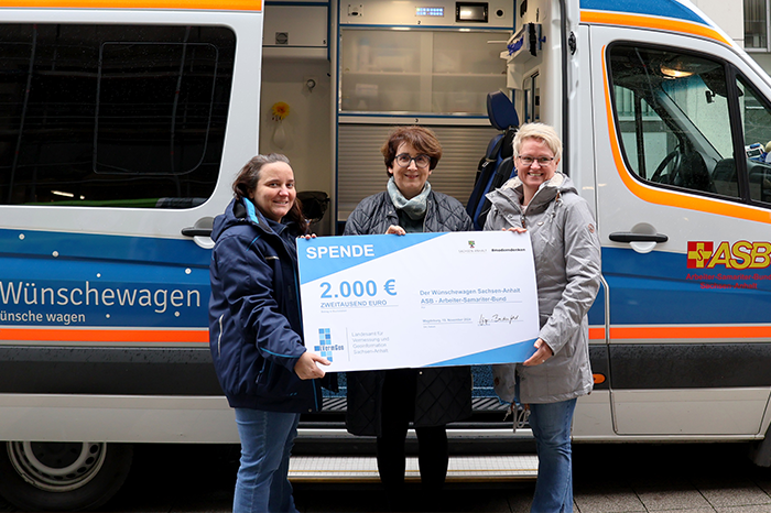 Der Erlös aus der Spendenaktion wurde durch die Präsidentin, Frau Cordula Jäger-Bredenfeld, und Frau Janine Hoffmann vom LVermGeo ST an Frau Luisa Garthof vom Wünschewagen des ASB übergeben. Die Unterstützung des Wünschewagens ist den Mitarbeitenden ein wichtiges Anliegen. Ein Dank gilt allen Beteiligten, die durch ihre Spenden und Teilnahme zu diesem Erfolg beigetragen haben.