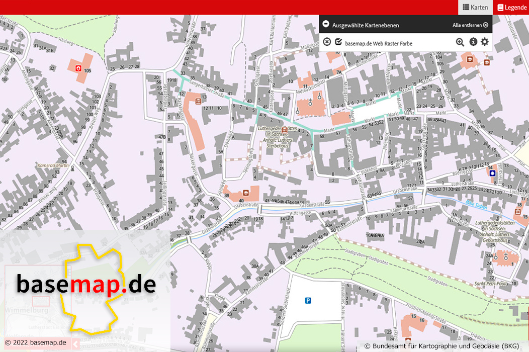 Auf der Grundlage amtlicher Geobasisdaten vermittelt basemap.de Web Raster eine attraktive deutschlandweit einheitliche Kartendarstellung in Zoomstufen vom Einzelgebäude bis zur Deutschlandübersicht. Ihre leistungsfähige Realisierung auf Basis internationaler Standards und ihre moderne kartographische Gestaltung unterstützen vielfältige Anwendungsbereiche.