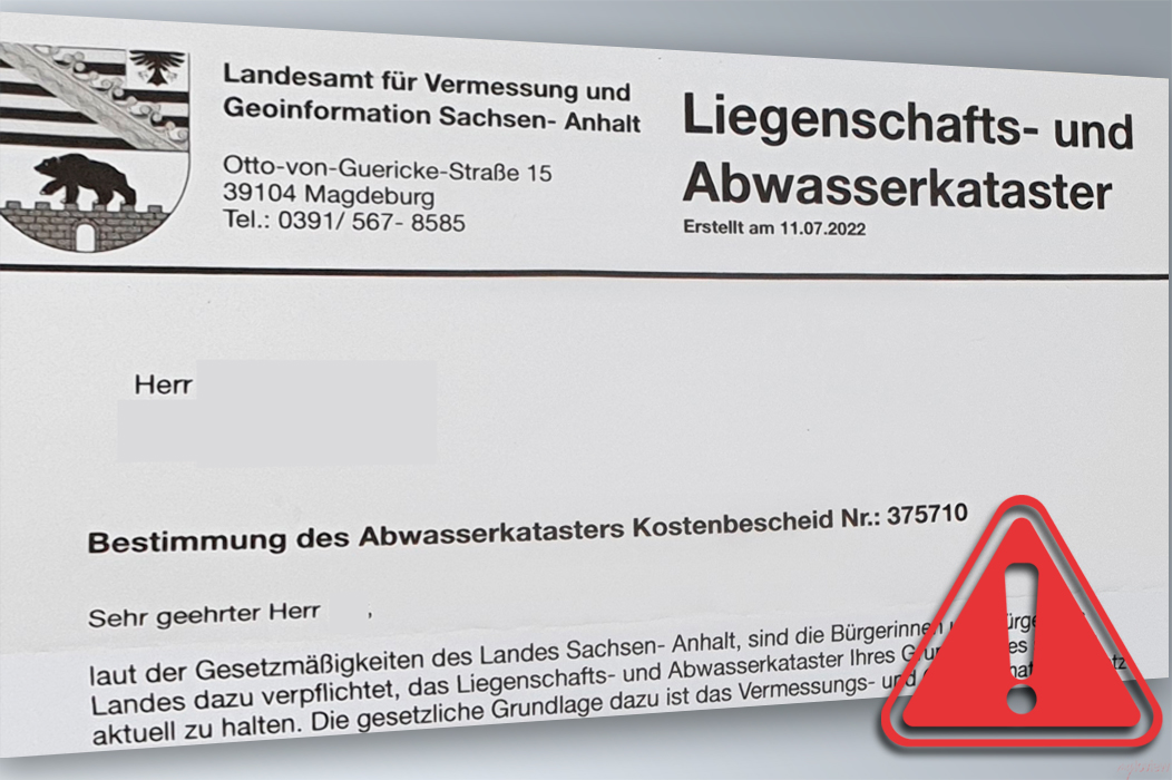 In den Schreiben wird eine dreistellige Summe als Überweisung für eine angebliche Bestimmung des Abwasserkatasters gefordert. Im Briefkopf wird das Wappen des Landes Sachsen-Anhalt und die Behördenbezeichnung „Landesamt für Vermessung und Geoinformation Sachsen-Anhalt“ verwendet.