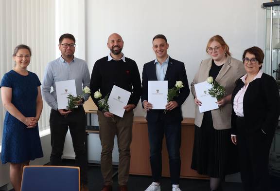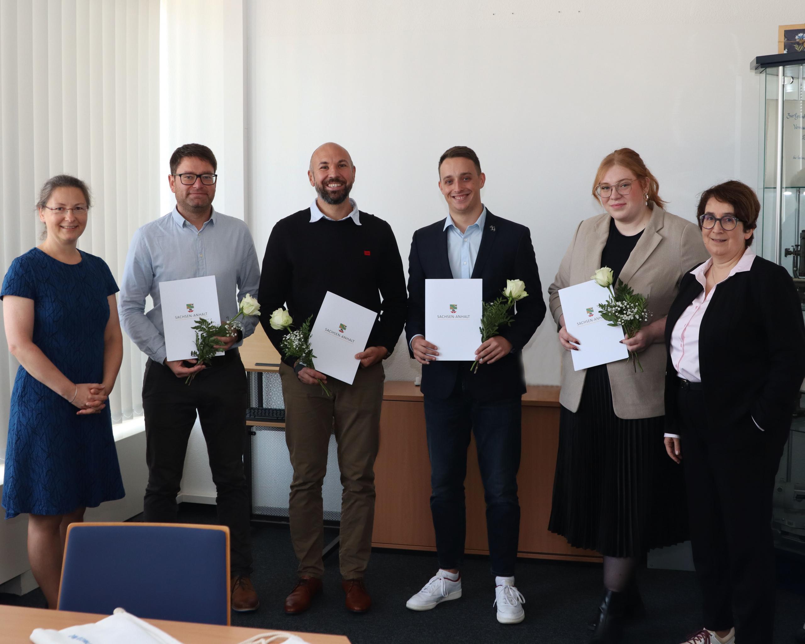 Nachdem die Anwärterin Wiebke Hartmann und die Anwärter Christian Bach, Matthias Hoffmann und Jerome Pascal Gladis ihre Laufbahnprüfungen am 27.09.2024 erfolgreich absolviert hatten, fand wenige Tage später die feierliche Prüfungszeugnisübergabe durch die Präsidentin des Landesamtes für Vermessung und Geoinformation Sachsen-Anhalt, Frau Cordula Jäger-Bredenfeld, und die stellvertretende Vorsitzende des Prüfungsausschusses, Frau Anke von Wnuck, statt.