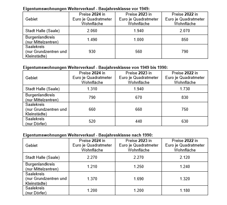 Besonders hervorzuheben aber ist bei den regionalen Entwicklungen der Teilmarkt der Weiterverkäufe von Eigentumswohnungen. Beim Weiterverkauf handelt es sich um bestehendes (gebrauchtes) Wohnungseigentum, welches vom Wohnungseigentümer weiterverkauft wird. Die Hauptentwicklung fand in diesem Teilmarkt in der Stadt (Halle) mit 324 Verkäufen im Jahr 2024 statt. Die Landkreise Saalekreis mit 151 Verkäufen und der Burgenlandkreis mit 187 Verkäufen kommen in Summe gerade auf die gleiche Anzahl von Verkäufen wie in der Stadt Halle (Saale). Im Kreis Mansfeld-Südharz wurden 2024 lediglich 22 Weiterverkäufe registriert, sodass die Preisentwicklung in diesem Landkreis nachfolgend nicht näher ausgewertet wird.