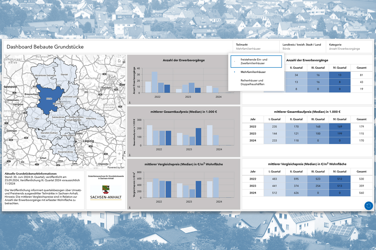 Damit sind Informationen über die aktuellen Trends auf dem Immobilienmarkt in den Landkreisen, den kreisfreien Städten und dem Land Sachsen-Anhalt zeitnah verfügbar.