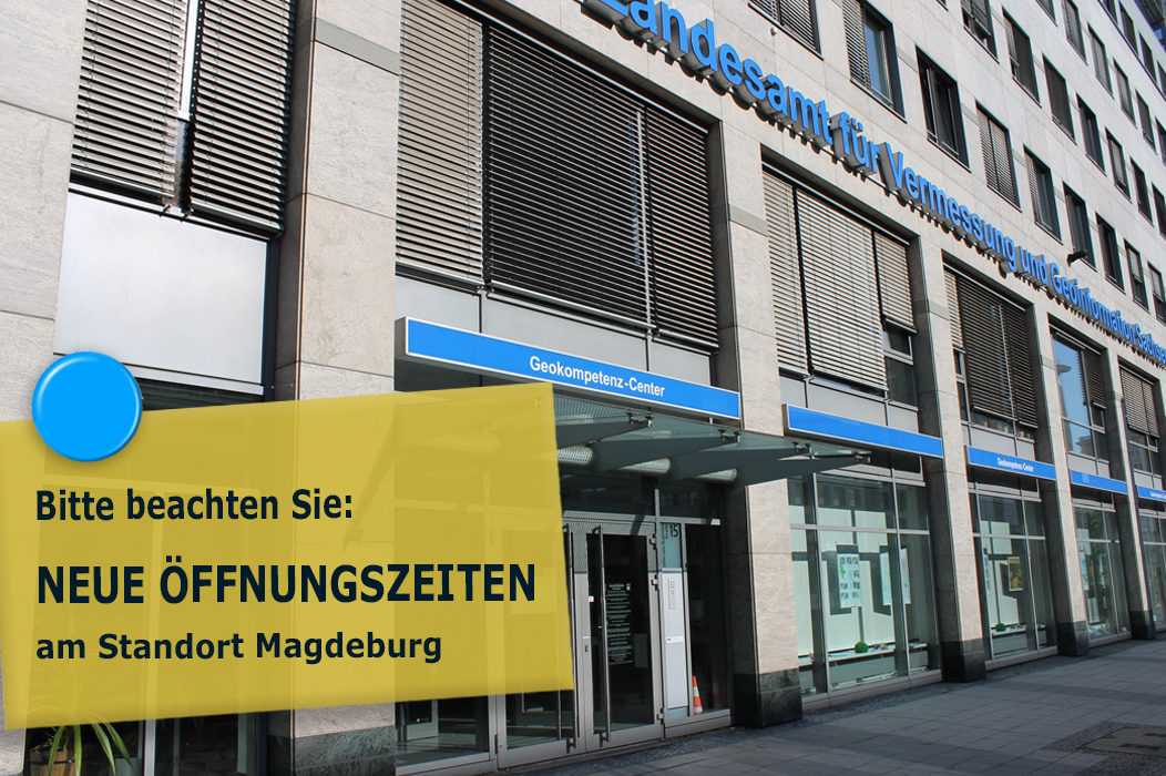 Bitte beachten Sie die zum 1. Februar 2023 geänderten Öffnungszeiten des Geokompetenz-Centers am Standort Magdeburg. Das Geokompetenz-Center hat von Montag bis Freitag von 08:00 Uhr bis 13:00 Uhr und zusätzlich für Antragsannahme und Information am Dienstag von 13:00 Uhr bis 18:00 Uhr für Sie geöffnet.