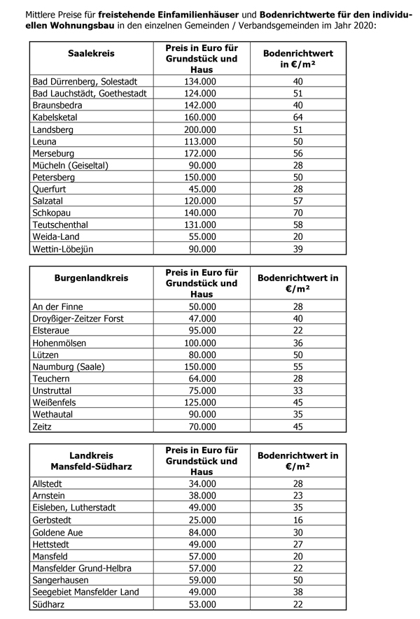 Welchen Einfluss hat Corona auf den Markt für Wohnimmobilien? Auch auf diese Frage gibt der aktuelle Grundstücksmarktbericht eine Antwort. Die seit einem Jahr währende Corona-Pandemie lässt derzeit keinen Einbruch bei der Anzahl der Verkäufe sowie bei den Immobilienpreisen erkennen. Dies gilt auch für das Umland von Halle (Saale). Im Saalekreis, im Burgenlandkreis sowie im Landkreis Mansfeld-Südharz sind stabile Verhältnisse auf dem Immobilienmarkt zu verzeichnen. So liegen die Preise für freistehende Einfamilienhäuser im Saalekreis bei 120.000 Euro (14 Prozent höher als 2019). Im Burgenlandkreis sind es 80.000 Euro (etwas weniger als 2019) und im Landkreis Mansfeld-Südharz 50.000 Euro (gleichbleibend zu 2019). Auch in den Landkreisen gibt es regionale Preisunterschiede. Diese werden in der Anlage deutlich, wo die Durchschnittspreise für Eigenheime auf Gemeindeebene aufgeführt sind. Ebenso enthält die Anlage eine Aufstellung des mittleren Bodenrichtwertniveaus für Baugrundstücke des individuellen Wohnungsbaus.