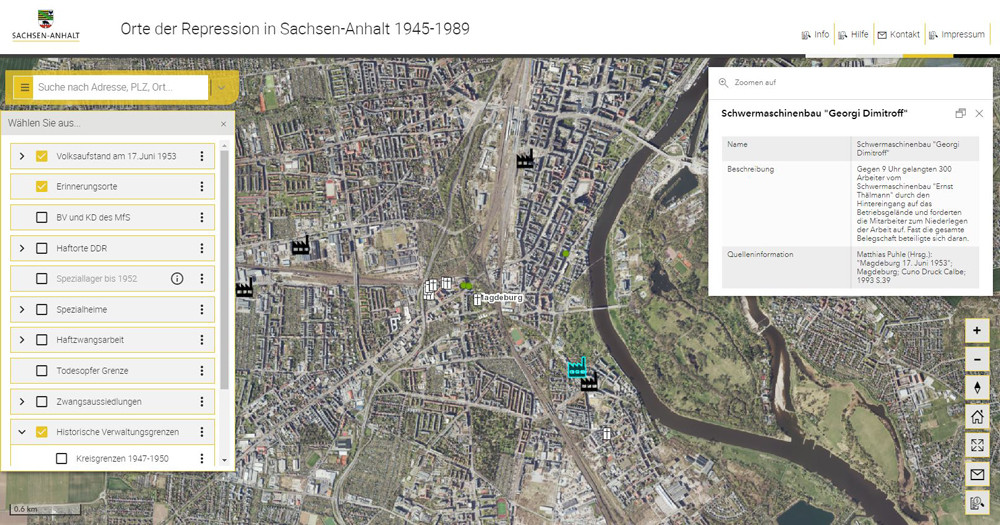 Auf Basis von umfangreichen Recherchen der Behörde der Beauftragten des Landes Sachsen-Anhalt zur Aufarbeitung der SED-Diktatur (LzA) wurden sämtliche Orte bzw. Betriebe mit Protesten rund um den 17. Juni 1953 dokumentiert und in der Geoanwendung verortet. Außerdem wurde ein zusätzlicher Kartenlayer mit Informationen zu Todesopfern, die im Zusammenhang mit dem 17. Juni 1953 stehen, integriert.