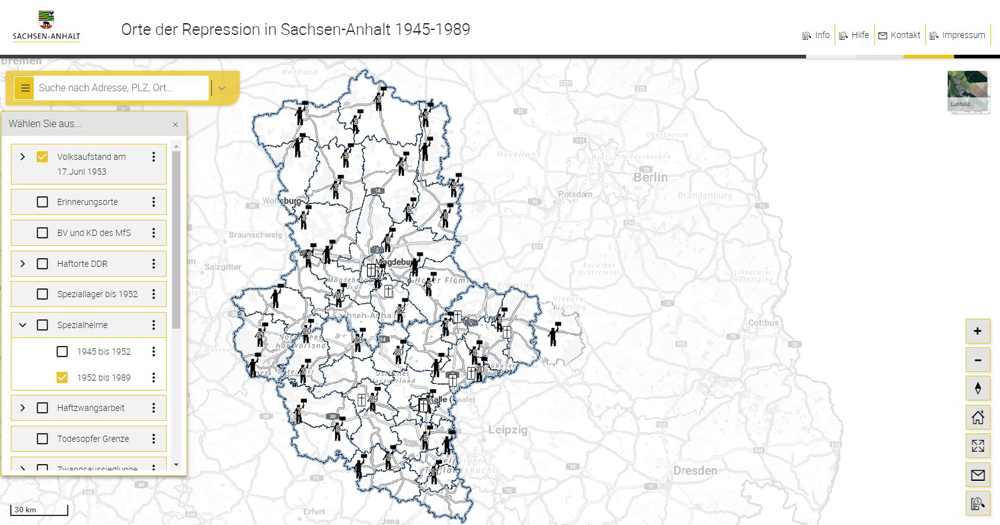 In einem Gemeinschaftsprojekt der LzA und des Landesamtes für Vermessung und Geoinformation (LVermGeo) wurde die Geoanwendung zur Darstellung historischer Orte der Repression auf dem Gebiet des heutigen Sachsen-Anhalt entwickelt und am 9. November 2021 zum 32. Jahrestag des Mauerfalls veröffentlicht. Auf der Grundlage einer vom LzA vorgenommenen Sammlung von Daten hat das LVermGeo diese unter Verwendung der Technologiekomponenten des Zentralen Geodatenknotens Sachsen-Anhalt (ZGDK) digitalisiert und präsentationsfähig aufbereitet. Seit 2022 erfolgt eine schrittweise Erweiterung der Anwendung um weitere Themen sowie die Einbindung von Bilddaten, um dem Nutzer weitere anschauliche Information zur Verfügung zu stellen. Die Geoanwendung wird auf der Webseite der LzA im Landesportal (https://aufarbeitung.sachsen-anhalt.de/) präsentiert und ist unter dem Link https://www.geodatenportal.sachsen-anhalt.de/gfds/de/repressionsorte.html aufrufbar.
