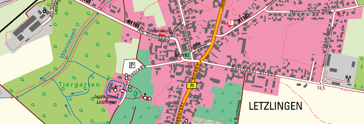 Themen: Siedlung, Gewässer, Vegetation, Verkehr, Relief, Gebiete und Gitter, Sonderlayer "flur"