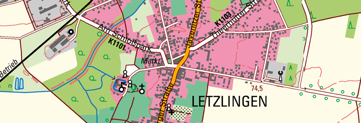 Digitale Topographische Karten sind als Web Map Service - WMS flächendeckend als mehrfarbige oder Graustufen-Variante kostenfrei erhältlich. Die DTK25 können bei Bedarf auch als Einzellayer gesondert nach Themenbereichen abgegeben werden.