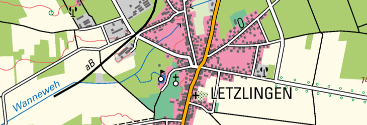 Der Layer kann mit anderen Layern aus den Objektbereichen Gewässer und Relief zu einer Orohydrographischen Karte kombiniert werden.