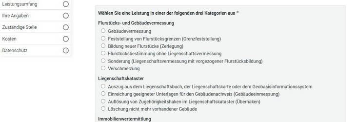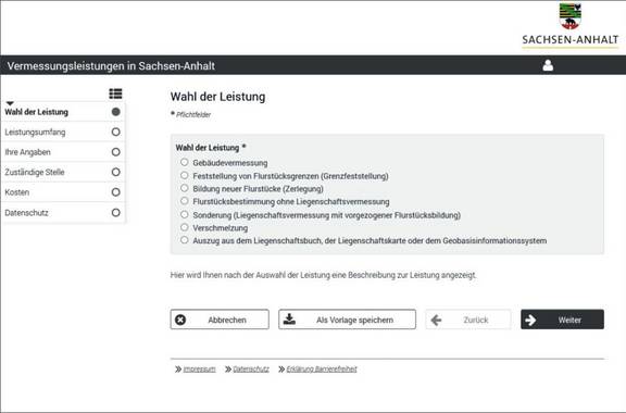 werden derzeit vom Landesamt für Vermessung und Geoinformation sowie von den Öffentlich bestellten Vermessungsingenieuren des Landes Sachsen-Anhalt im Onlinedienst angeboten und Sie können (je nach Leistung) bei der Online-Antragstellung zwischen diesen zuständigen Stellen wählen.
